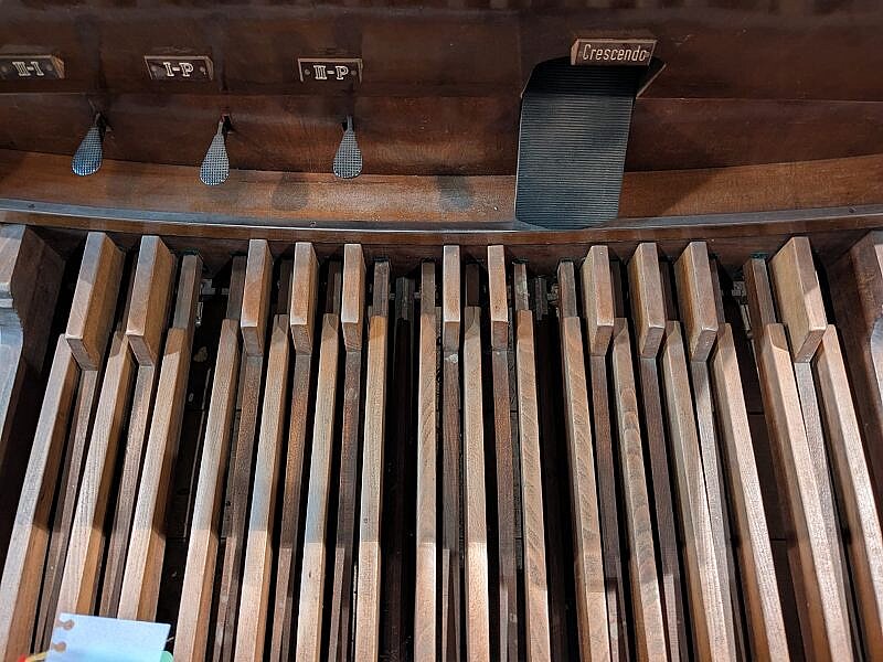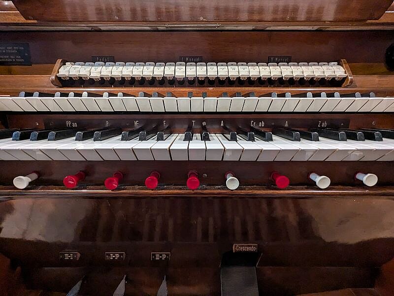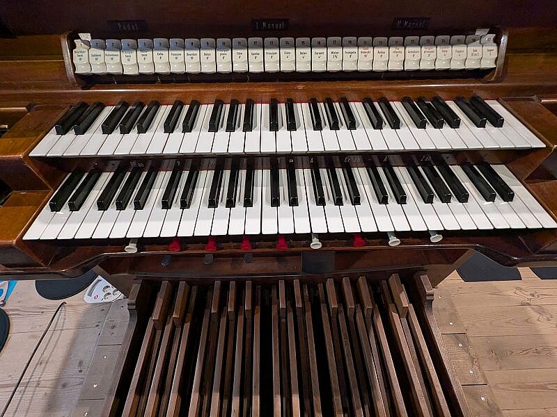 | Spielhilfen | Koppeln: II-I, I-P, II-P, Sub II-I, Super (Wippschalter) Fixe Kombinationen: p, mf, f, Tutti, Auslöser (Druckknöpfe) Piano-Pedal An/Ab (Wechseldruckknopf) Zungen An/Ab (Wechseldruckknopf) Crescendo An/Ab, Auslöser (Druckknöpfe) Crescendotritt |