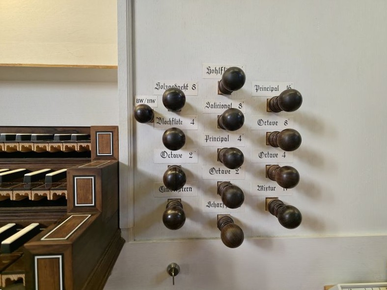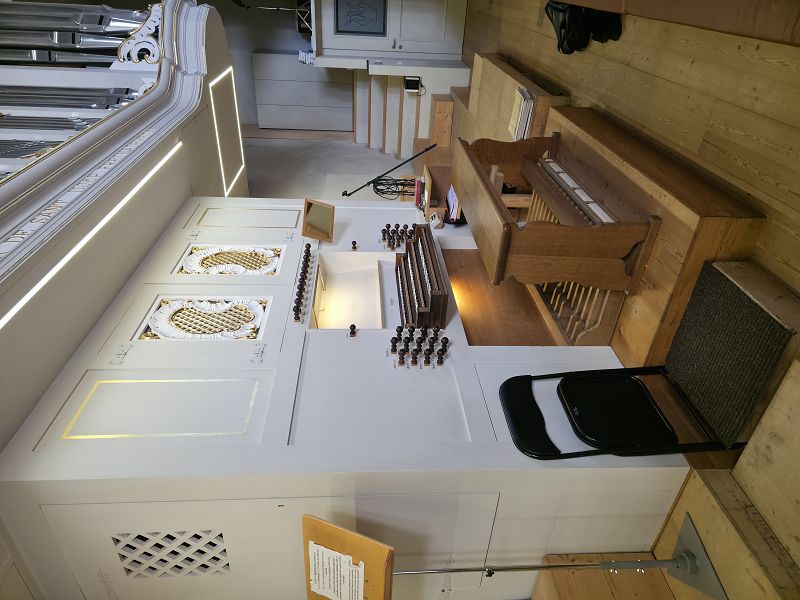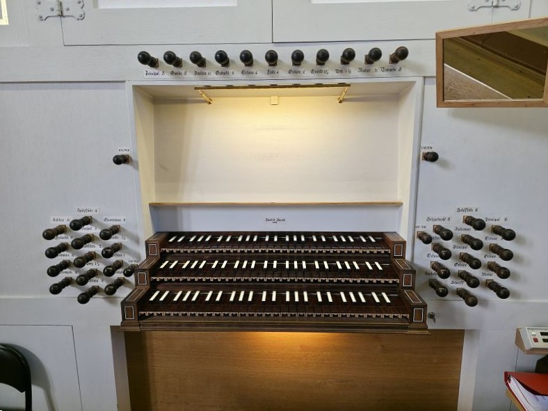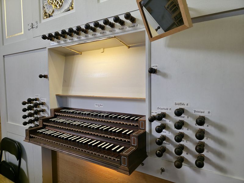 Spielhilfen | Koppeln: I-II, III-II, II-Ped, III-Ped Cimbelstern, Tremulant |