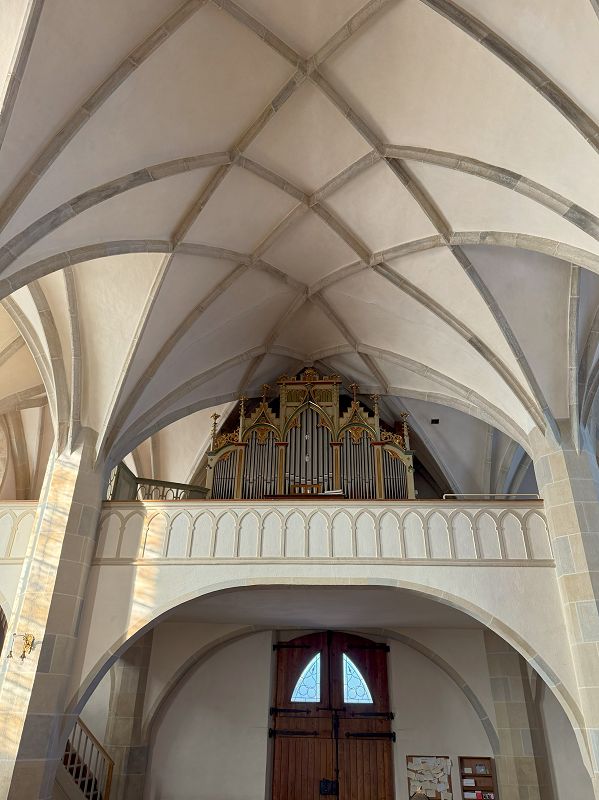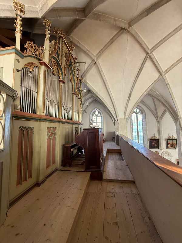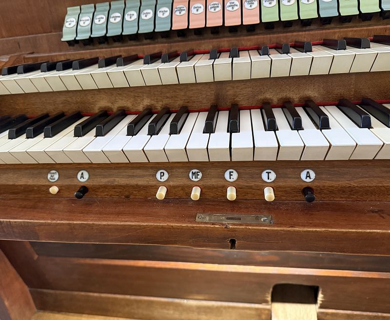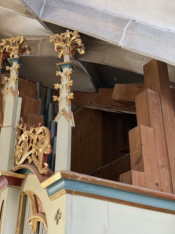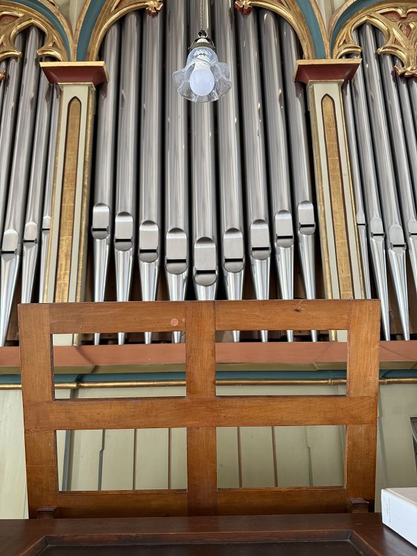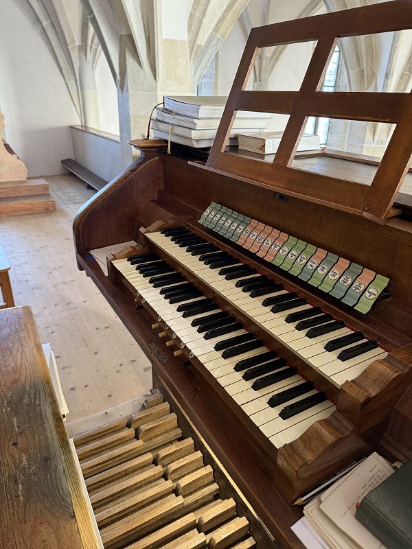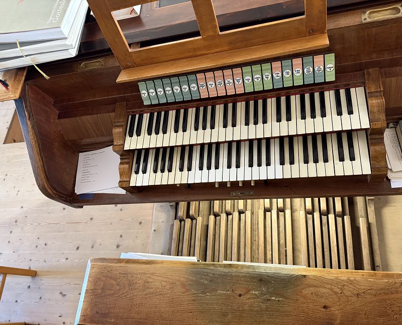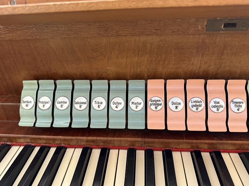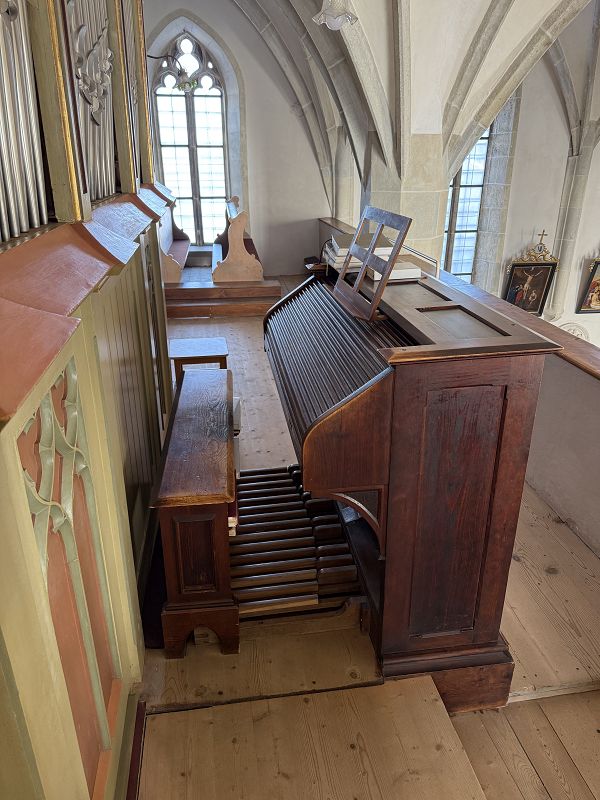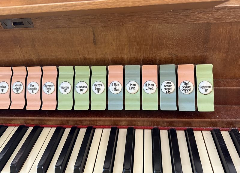 | Spielhilfen | Koppeln: II-I, I-P, II-P, Sub II-I, Super I, (Wippschalter) Fixe Kombinationen: p, mf, f, Tutti (Druckknöpfe) 2 Auslöser für feste Kombinationen (Druckknöpfe) Ausschaltung autom. Pedal (Wechseldruckknopf) Schwelltritt |